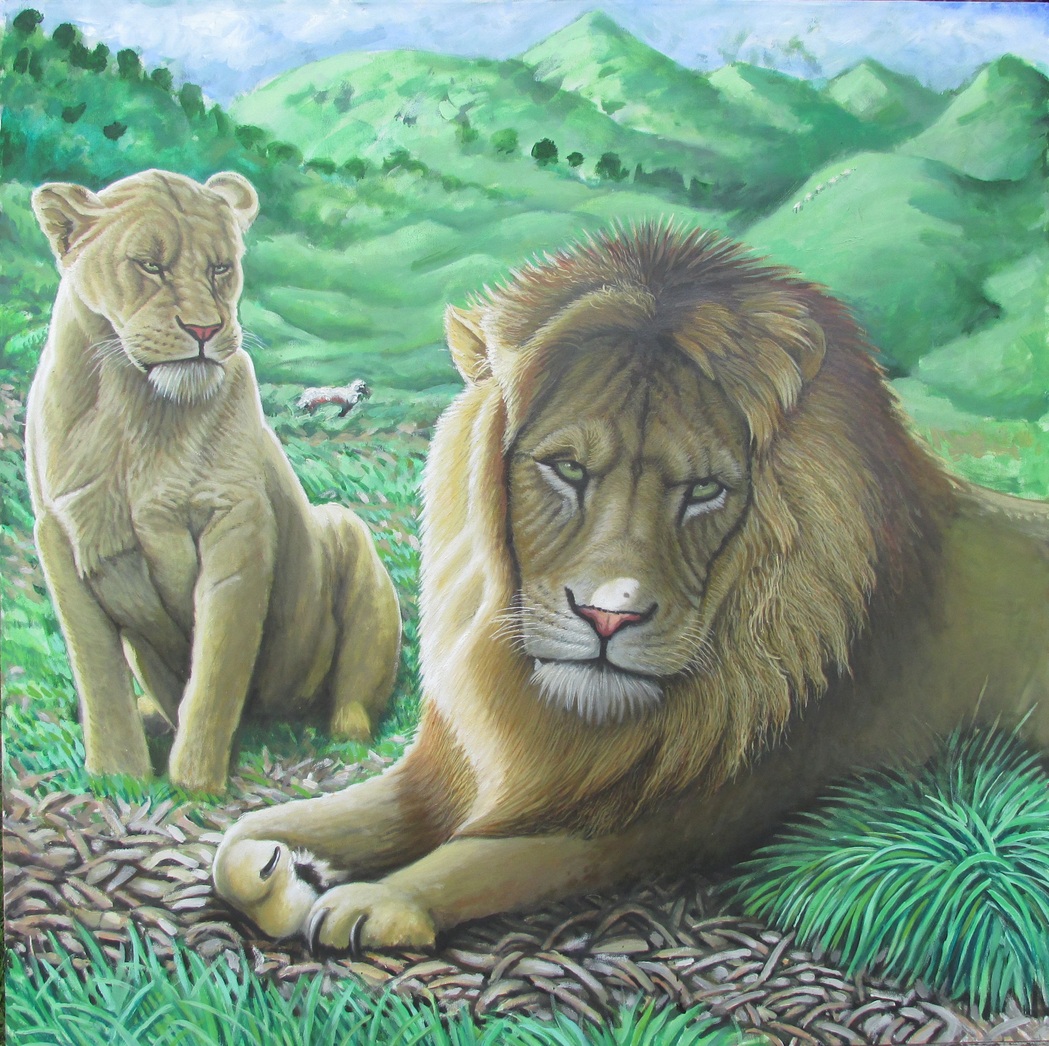 A large oil painting by Darryl Walker featuring Zulu and his mate the Lions of Borth Walesimagined as set free roaming the Welsh hills