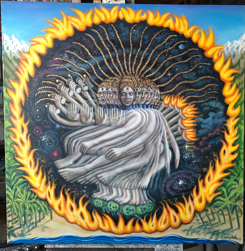 original oil painting by Darryl Walker evisioning the Hindu God Shiva in motion doing his dance of creation and destruction