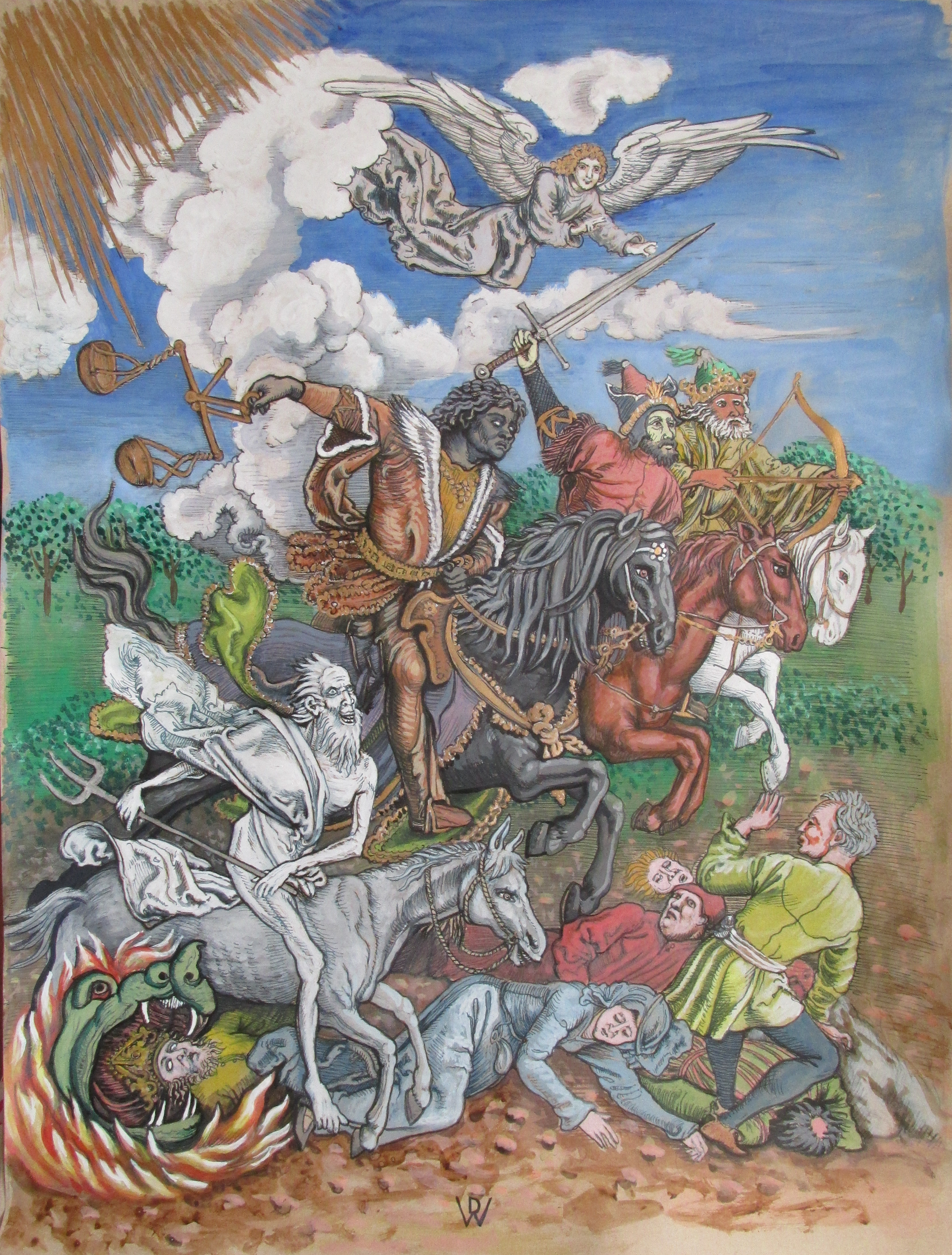Original watercolour by Darryl Walker, inspired by an engraving by Albrecht Durer of the Four Horsemen of the Apocalypse. Available framed collection only or for delivery unframed